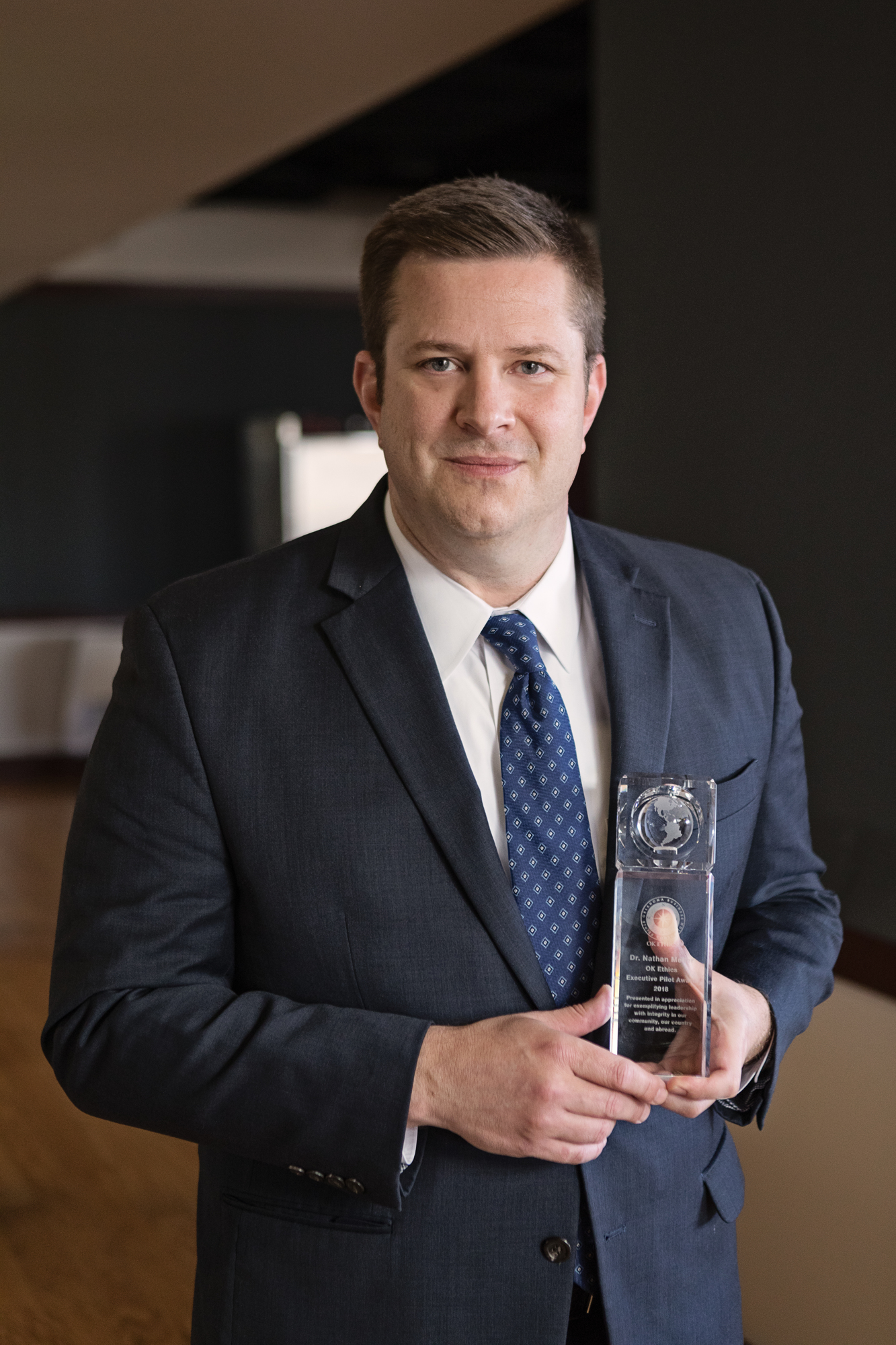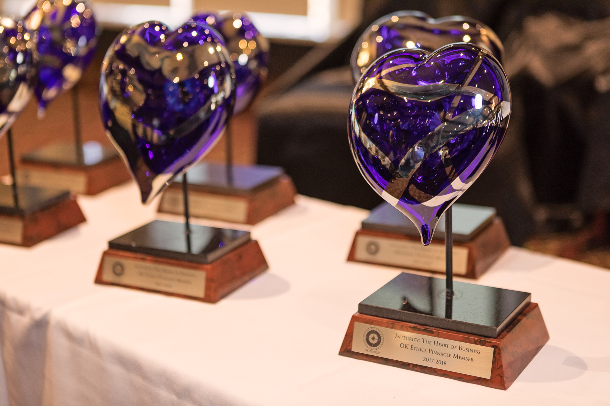 Made from broken pieces of glass, the 2018 Pinnacle Member Honors were designed and blown by Chris McGahan of Bella Forte Studios in OKC. A tradition since OK Ethics Tenth anniversary in 2013, the pieces represent the spirit of Oklahoma and is intended as a reminder that integrity should be at the heart of everything we do. The blue reflects OK Ethics and the Spirit of Oklahoma. A technique known as Redento Raffinato has many layers and depth - reflecting the character that Oklahomans bring to their lives.