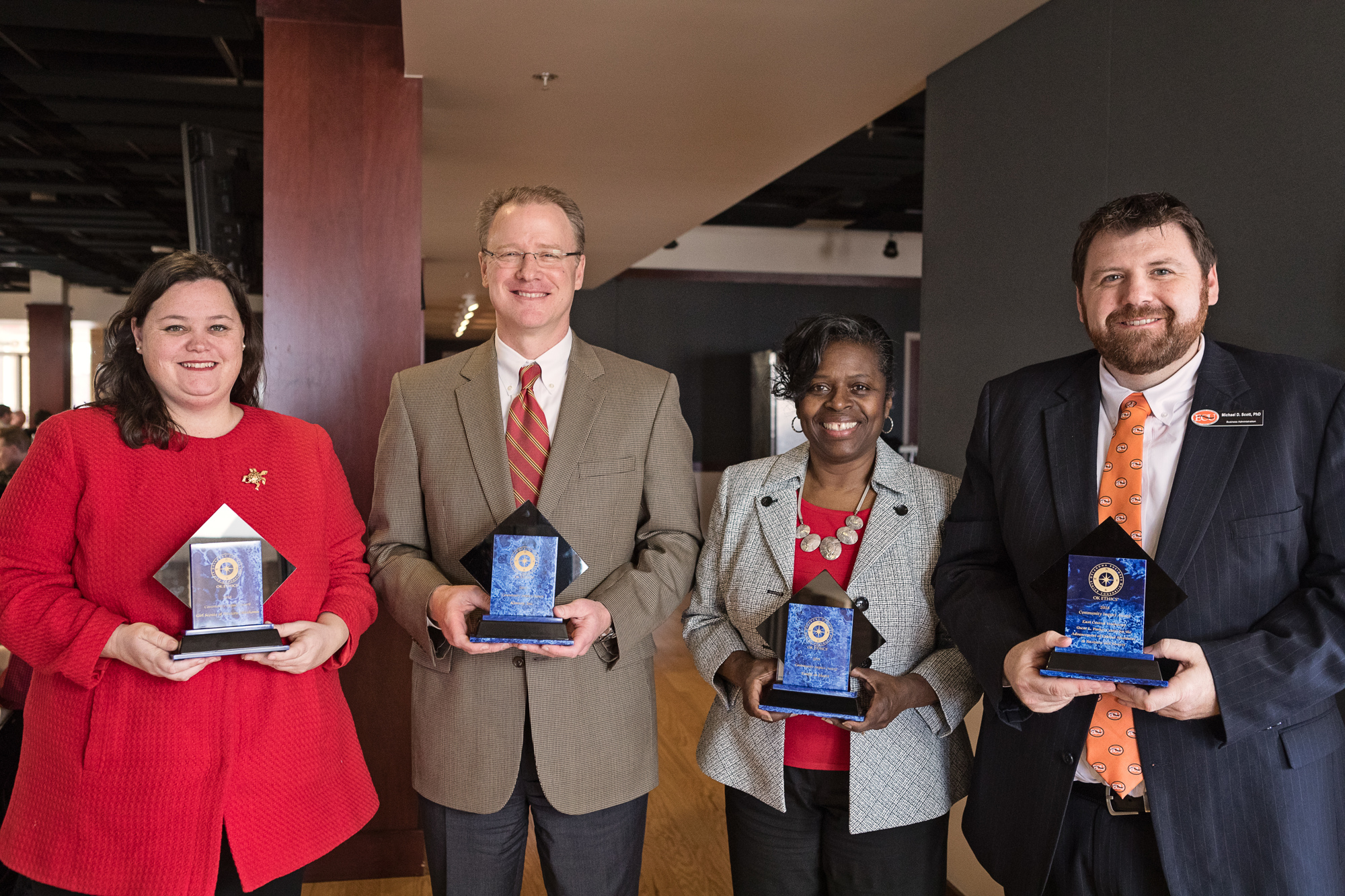 Congratulations to (l to r): Co-winner of the Nonprofit Category -Shannon Evers, CEO, Girl Scouts of Western Oklahoma (OKC); Bob Cole, President, Kimray Inc (OKC) - Winner of the Cultural Impact Category; Co-winner of the Nonprofit Category -Jocelyn McCarver, President & CEO of Youth At Heart (Tulsa) Professor Michael Scott, Director of ECU's Parker Ethics Center - Winner of the Education Category (Ada)