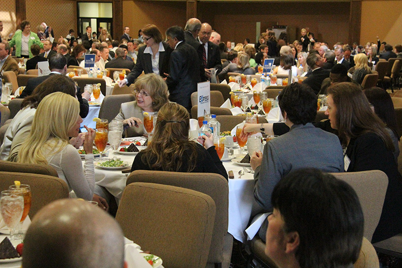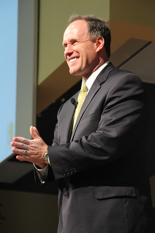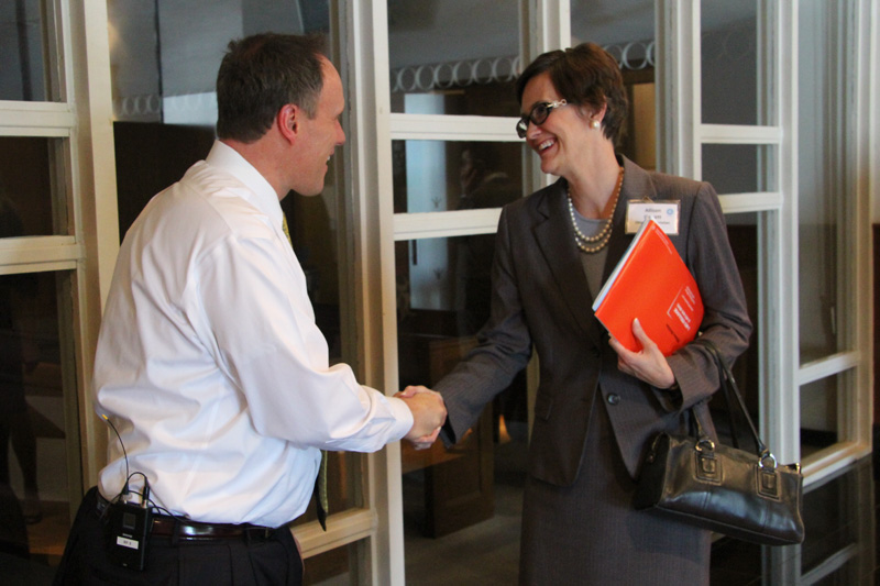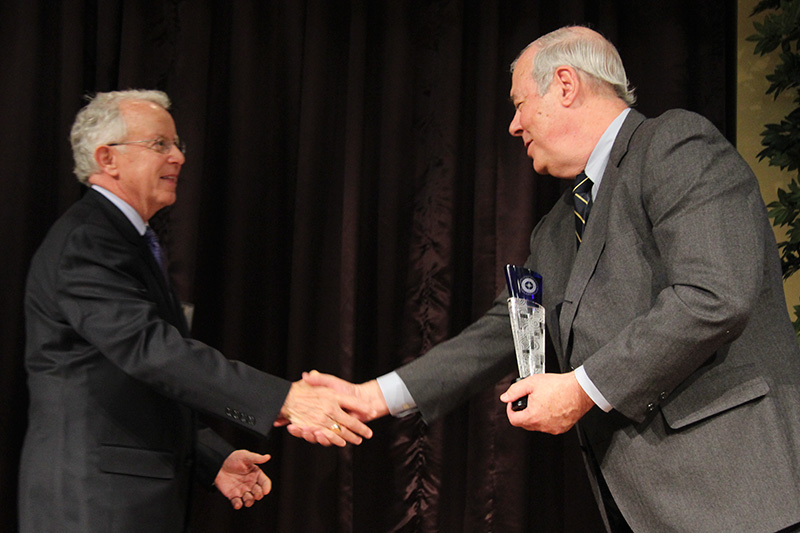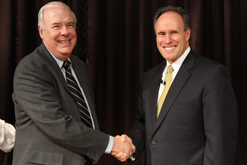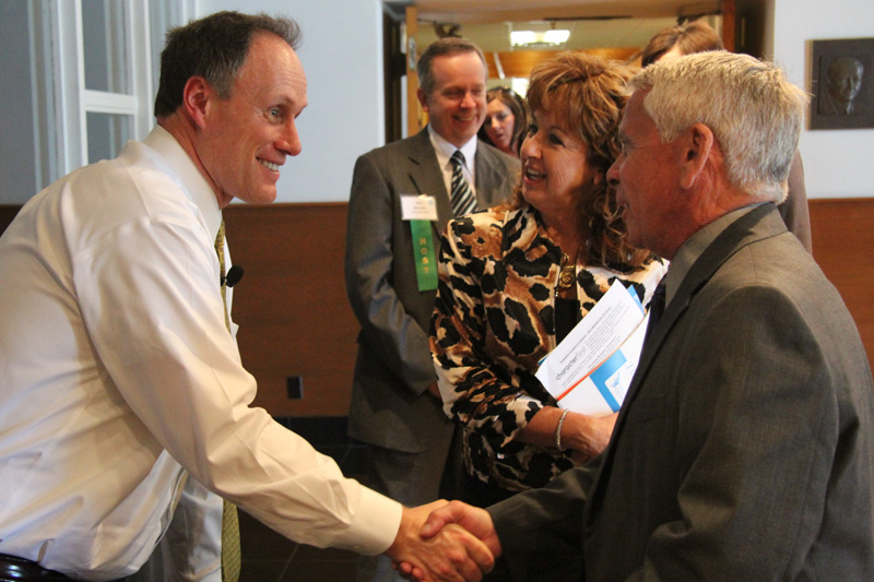Compass Award Chairperson Mike Strong greets keynote speaker Stephen M. R. Covey. |