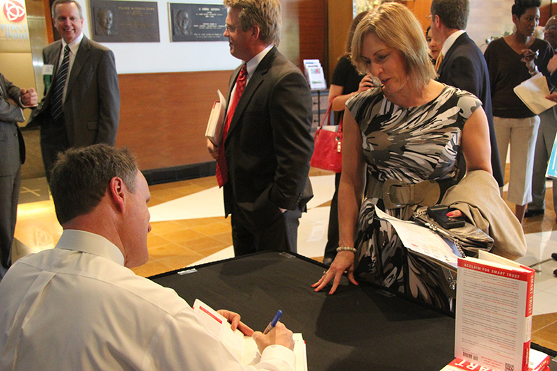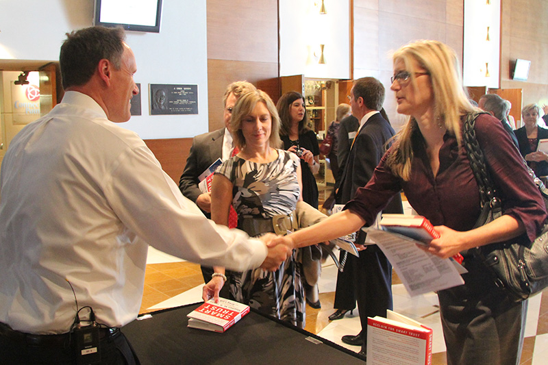 Mr. Covey visits with Lynn Flinn, Founder of the OK Ethics Tulsa Chapter. |