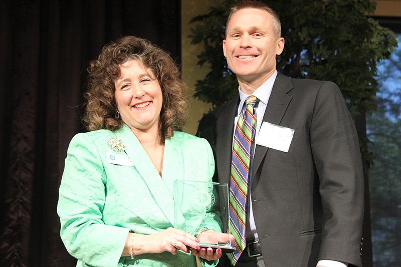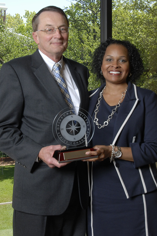 | OK Ethics Founder Shannon Warren presents Honorable Mention award to Jeff Parduhn of Pelco Products. |