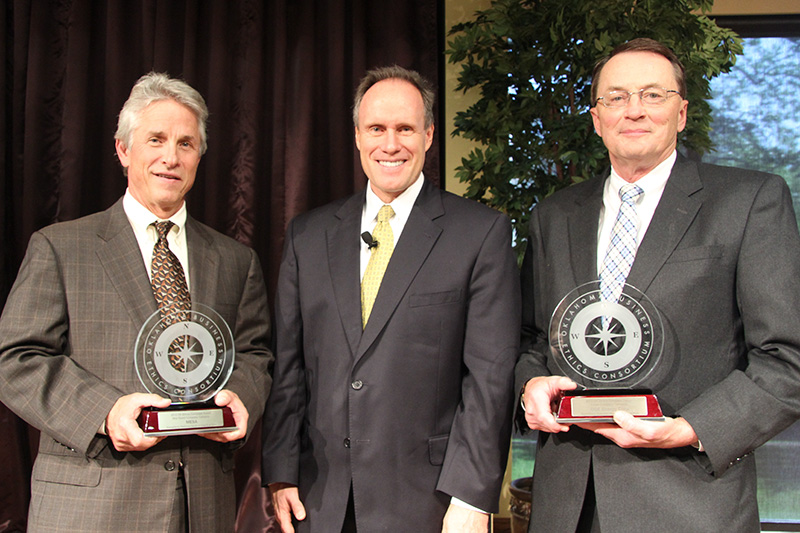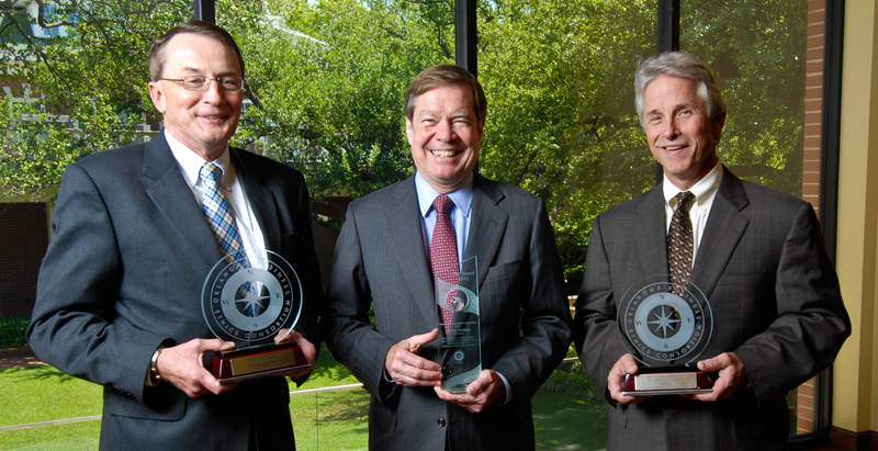 | (Pictured left to right) Compass Award for the large company category, Gary Huneryager, OGE Energy Corp; Executive Pilot Award recipient Larry Nichols of Devon Energy and winner of the Compass Award for the mid-sized company category, Terry May of MESA. |